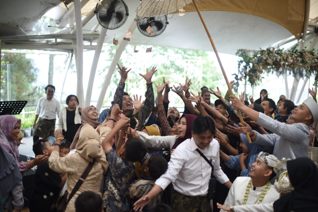 Taburan saweran disebar pada payung yang menaungi kedua mempelai yang berada di bawahnya. Selama prosesi berlangsung juru sawer menembangkan kidung berisi nasihat sebagai bekal kedua mempelai yang akan menempuh hidup baru.